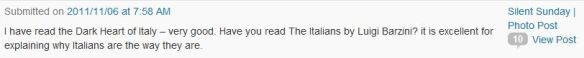 Debra first left a comment on my blog on November 6, 2011. It was on a few books I’d been reading at the time: The Dark Heart of Italy and The Italians. Both fantastic reads for a decent understanding into the Italian way of life.
